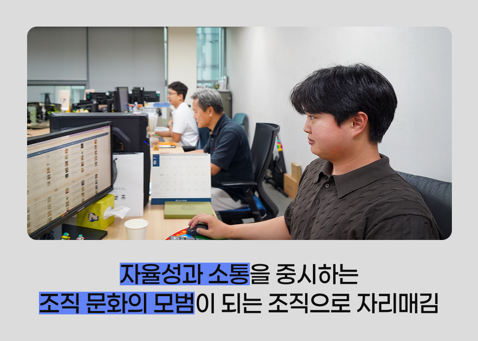 우리 파트는 자율성과 소통을 가장 큰 원칙으로 삼고 있습니다. 지시를 따르기보다 각자가 가진 생각과 논리를 자유롭게 펼치고, 때로는 부딪히기도 하면서 더 나은 결과를 찾아갑니다. 그래서 서로의 결과물을 칭찬하고 지지하는 분위기가 형성되어 있어요. 이런 문화 덕분에 새로 합류한 동료도 금세 적응할 수 있었습니다. 친근하게 맞아주는 분위기와 정확한 피드백 덕분이었죠. 우리가 지향하는 전사의 조직 문화 역시 이 연장선에 있습니다. 직원 모두가 자율성을 존중하면서도 따뜻한 분위기 속에서 함께 성장하는 것. 이것이 저희 파트가 만들어가고 싶은 모습입니다.