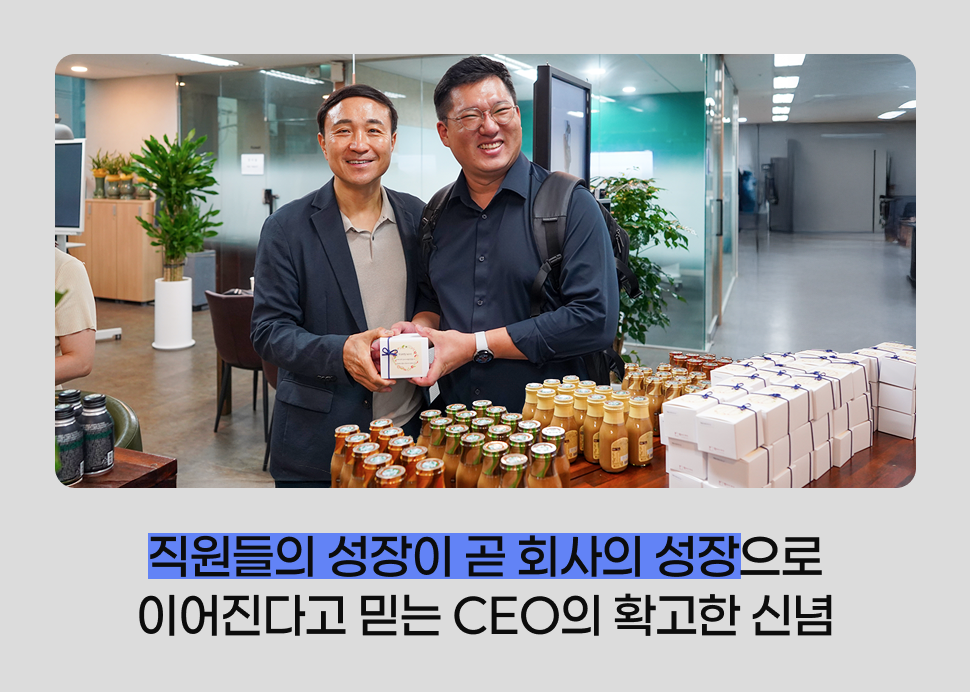 우리의 미션은 직원들의 성장을 돕는데 있습니다. 직원들이 교육을 통해 성장하고, 자신의 일을 더 잘할 수 있도록 돕는 것이 회사 발전으로 이어진다고 믿어요. 그래서 우리의 역할에는 경계가 없습니다. 대표이사와 직원 간의 직접 소통, 상품 이벤트 등을 통해 직원들에게 동기를 부여하고, 또한 현장의 불편한 근무 환경을 확인하고 개선하기도 했습니다. 예를 들어, 올여름에는 임직원 여러분의 쾌적한 근무 환경을 위해 야외 현장에 에어컨을 추가로 설치하고, 직원들이 직접 사용하는 시설의 노후 부문을 정비했습니다. 또한 텀블러 세척을 위해 화장실을 이용해야 했던 불편을 해소하고자 라운지에 전용 세척 설비를 마련해 직원들의 편의성을 높였습니다. 이처럼 크고 작은 변화들을 지속적으로 이어 가기 위해 직원들과의 소통을 적극적으로 확대하려고 합니다. 아직 전 직원들의 만족을 이끌어낼 수는 없지만, 불편 요소를 하나하나 개선해 가면 의미 있는 성과가 만들어질 것이라 기대하고 있습니다.