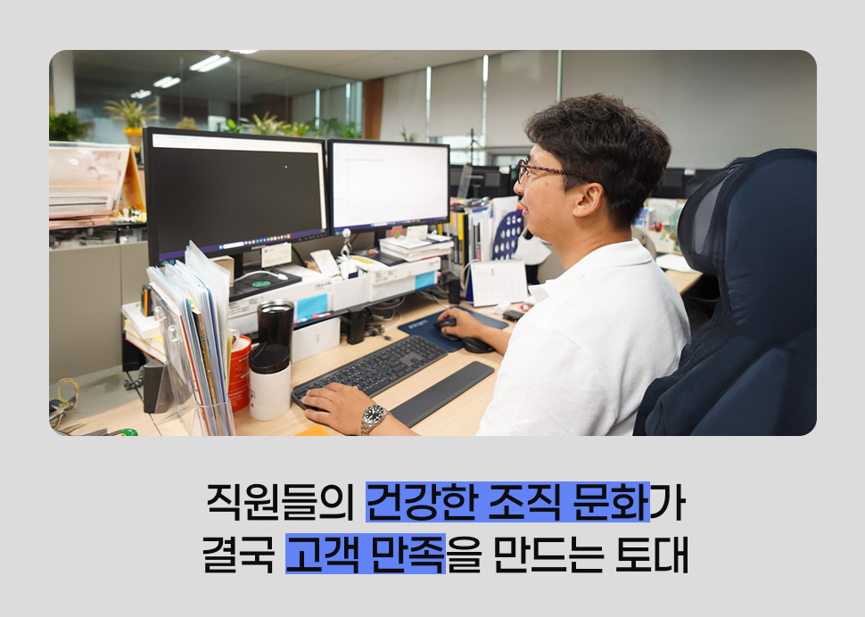건강한 조직문화는 직원 만족을 넘어, 고객과 회사 성과까지 이어집니다. 직원들이 즐겁게 일할 수 있는 환경이 마련되면 그 에너지가 고객에게 전달되고, 고객은 직원의 모습에서 회사를 신뢰하게 됩니다. 우리는 직원들이 회사에서 오래 머물고 싶고, 자부심을 느낄 수 있는 환경을 만들고자 합니다. 작은 배려와 지원이 쌓이면 직원은 더 즐겁게 일하고, 고객은 회사를 긍정적으로 바라보게 되죠. 지금은 작은 변화일 수 있지만, 3년, 5년 뒤에는 회사를 더 단단하게 만드는 밑거름이 될 것입니다. 건강한 조직문화는 회사의 혈액과도 같습니다. 직원들이 제 역할을 잘 하려면 뒤에서 충분한 지원이 따라야 합니다. 결국 직원 만족 → 고객 신뢰 → 회사 성장이라는 선순환의 출발점이 바로 건강한 문화에 있습니다.