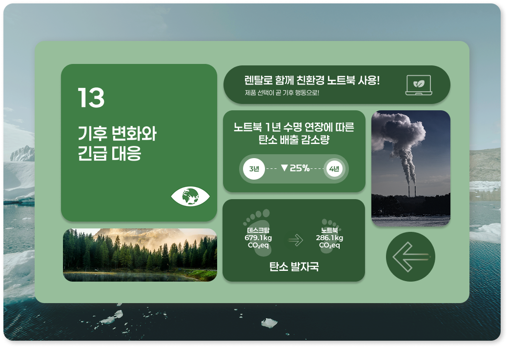 예를 들어, 노트북 갱신 주기를 3년에서 4년으로 늦추기만 해도 제조와 사용 단계에서 발생하는 탄소 배출이 최대 25%까지 감소한다는 연구 결과가 있습니다. 또한 노트북은 데스크톱 대비 전체 생애주기에서 탄소 발자국이 현저히 낮아, 에너지 절약과 탄소 절감에 효과적인 장비로 평가됩니다. 한국렌탈은 이러한 연구들을 기반으로 고객에게 친환경 장비 사용의 가치를 알리고, 제품 선택이 곧 기후 행동으로 이어진다는 메시지를 전하고 있습니다.